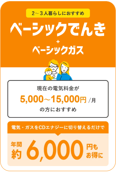 人数に合わせたプランあり ベーシックでんき+ベーシックガスなら約6,000円/年 お得※10 |