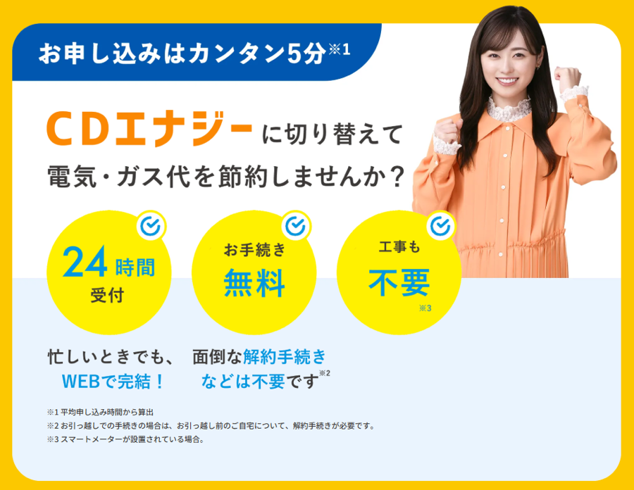 ※2 電気:CDエナジー「ベーシックでんき」東京電力エナジーパートナー「従量電灯B」 、ガス:CDエナジー「ベーシックガス」東京ガス「一般料金」との比較。※2026年2月時点。
