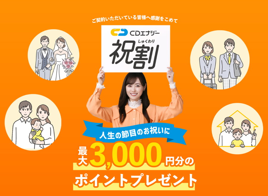 さらに、継続利用中も「祝割」という独自の還元制度が利用可能です。結婚や出産、お子様の入園・入学、新居への引越しなど人生の節目を申請するだけで「カテエネポイント」が付与されます。毎月の支払いで貯まるポイントとボーナスポイントを合わせれば、さらにお得になります。